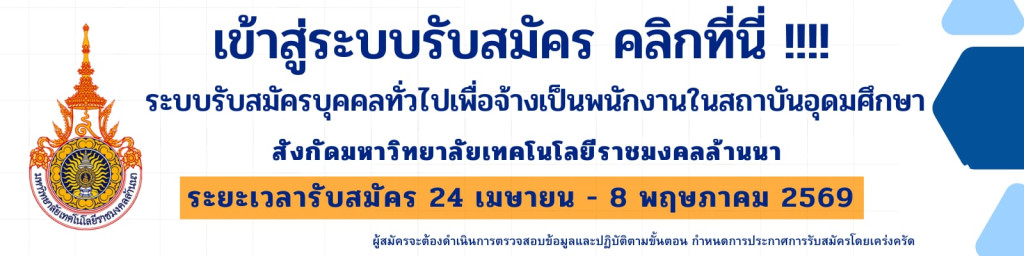 1. ประกาศมหาวิทยาลัยเทคโนโลยีราชมงคลล้านนา เรื่อง รับสมัครคัดเลือกบุคคลทัวไปเพื่อจ้างเป็นพนักงาน