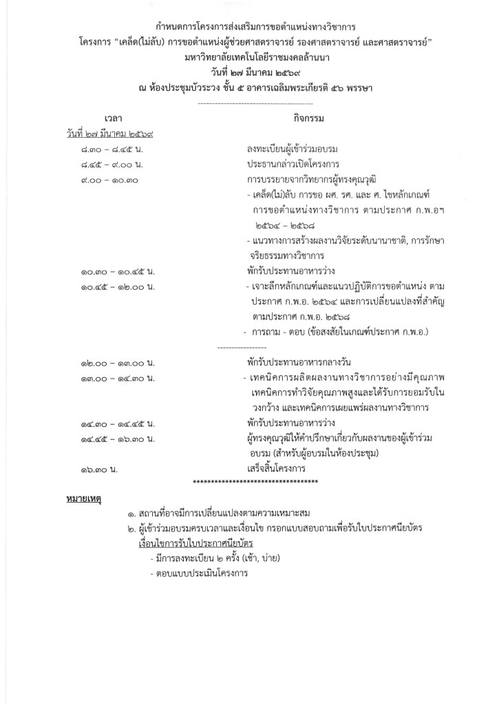 มหาวิทยาลัยเทคโนโลยีราชมงคลล้านนา โดยกองบริหารงานบุคคล กำหนดจัดโครงการ “เคล็ด (ไม่) ลับ การขอกำหนดตำแหน่ง ผู้ช่วยศาสตราจารย์ รองศาสตราจารย์ และศาสตราจารย์” ในวันที่ 23 มีนาคม 2569ห้องประชุมบัวระวง ชั้น 5 อาคารเฉลิมพระเกียรติ 50 พรรษา มหาวิทยาลัยเทคโนโลยีราชมงคลล้านนา พร้อมเปิดโอกาสให้ผู้สนใจสามารถเข้าร่วมรับฟังผ่านระบบออนไลน์ได้