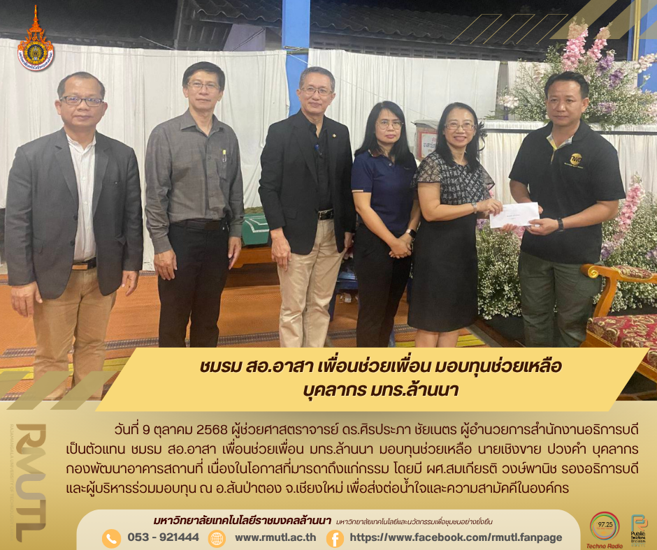 วันที่ 9 ตุลาคม 2568 ผู้ช่วยศาสตราจารย์ ดร.ศิรประภา ชัยเนตร ผู้อำนวยการสำนักงานอธิการบดี มทร.ล้านนา เป็นตัวแทน ชมรม สอ.อาสา เพื่อนช่วยเพื่อน มอบทุนทรัพย์เพื่อช่วยเหลือ นายเชิงขาย ปวงคำ บุคลากรกองพัฒนาอาคารสถานที่ เนื่องในโอกาสที่มารดา คุณแม่อำนวย ปวงคำ ถึงแก่กรรม