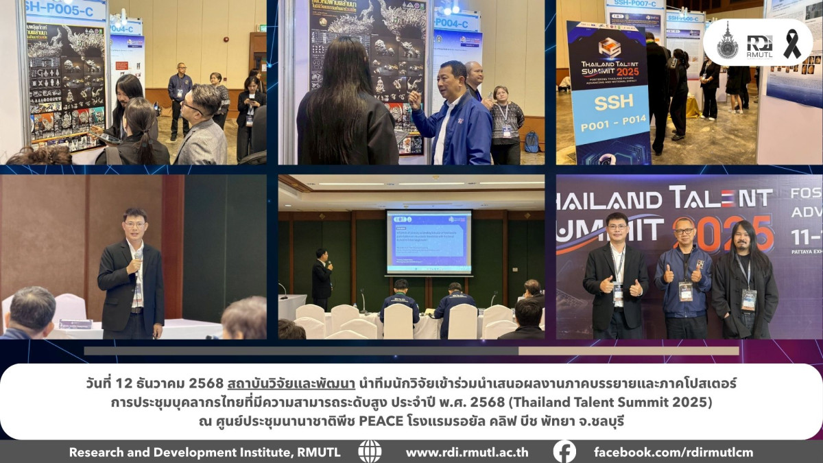 สถาบันวิจัยและพัฒนา มหาวิทยาลัยเทคโนโลยีราชมงคลล้านนา (สวพ. มทร.ล้านนา) ให้การสนับสนุนอาจารย์และนักศึกษาในการนำเสนอผลงานวิจัยและผลงานสร้างสรรค์ในเวทีระดับชาติ Thailand Talent Summit 2025 ซึ่งจัดโดย สำนักงานคณะกรรมการส่งเสริมวิทยาศาสตร์ วิจัยและนวัตกรรม (สกสว.) เพื่อส่งเสริมการแลกเปลี่ยนองค์ความรู้ทางวิชาการและยกระดับศักยภาพกำลังคนด้านวิทยาศาสตร์ วิจัย และนวัตกรรมของประเทศ