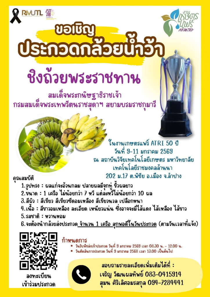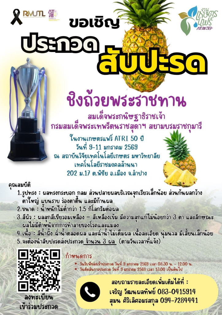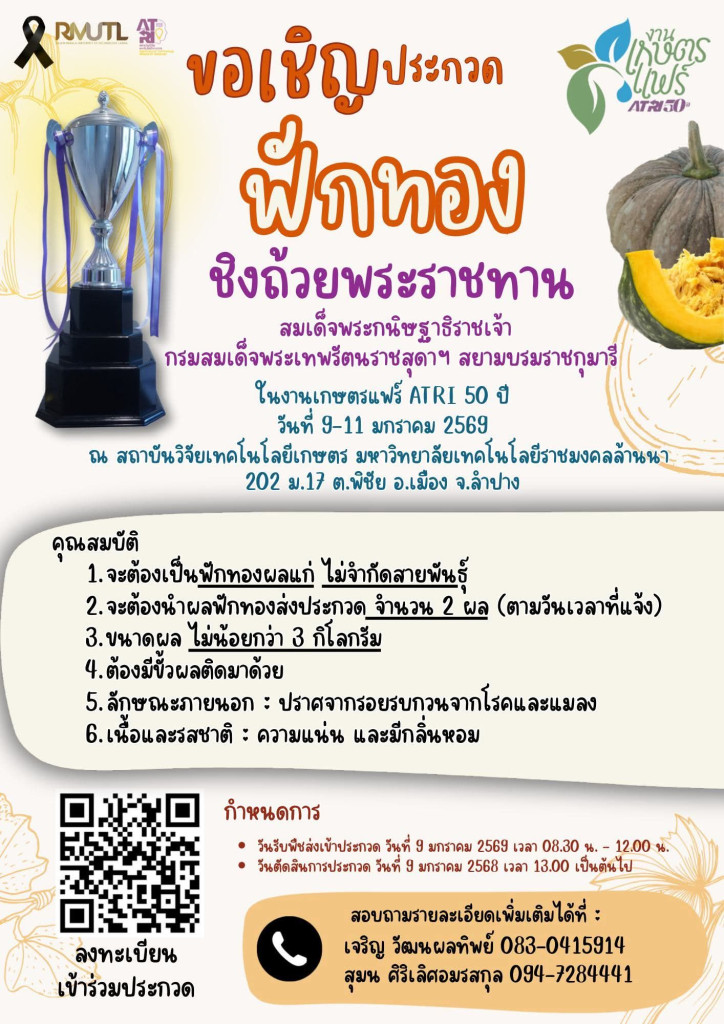 สถาบันวิจัยเทคโนโลยีเกษตร มหาวิทยาลัยเทคโนโลยีราชมงคลล้านนา ขอเชิญเกษตรกร นักศึกษา และประชาชนทั่วไป ร่วมงาน “"เกษตรแฟร์ ATRI (ครั้งที่ 2) และ 50 ปี สวก."” ระหว่างวันที่ 9-11 มกราคม 2569 ณ สถาบันวิจัยเทคโนโลยีเกษตร ตำบลพิชัย อำเภอเมือง จังหวัดลำปาง ภายในงานพบกับกิจกรรมมากมาย อาทิ