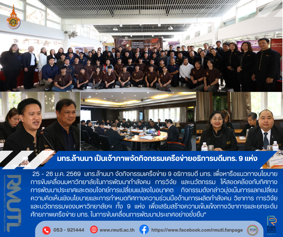 มหาวิทยาลัยเทคโนโลยีราชมงคลล้านนา (มทร.ล้านนา) เป็นเจ้าภาพจัดกิจกรรม เครือข่ายอธิการบดีมหาวิทยาลัยเทคโนโลยีราชมงคล 9 แห่ง ระหว่างวันที่ 25 – 26 มกราคม 2569 ณ มหาวิทยาลัยเทคโนโลยีราชมงคลล้านนา เพื่อหารือแนวทางนโยบายการขับเคลื่อนมหาวิทยาลัยในการพัฒนากำลังคน การวิจัย และนวัตกรรม ให้สอดคล้องกับทิศทางการพัฒนาประเทศและตอบโจทย์การเปลี่ยนแปลงในอนาคต กิจกรรมดังกล่าวมุ่งเน้นการแลกเปลี่ยนความคิดเห็นเชิงนโยบายและการกำหนดทิศทางความร่วมมือด้านการผลิตกำลังคน การวิจัย และนวัตกรรมของมหาวิทยาลัยเทคโนโลยีราชมงคลทั้ง 9 แห่ง เพื่อเสริมสร้างความเข้มแข็งทางวิชาการและยกระดับศักยภาพเครือข่ายมหาวิทยาลัยเทคโนโลยีราชมงคลในการขับเคลื่อนการพัฒนาประเทศอย่างยั่งยืน" โอกาสนี้ ผู้ช่วยศาสตราจารย์ ดร.อรรณพ ทัศนอุดม รักษาราชการแทนอธิการบดีมหาวิทยาลัยเทคโนโลยีราชมงคลล้านนา ได้กล่าวต้อนรับคณะอธิการบดีและคณะผู้บริหารจากเครือข่ายมหาวิทยาลัยเทคโนโลยีราชมงคล พร้อมนำเยี่ยมชม ศูนย์วิจัยวัสดุและกระบวนการผลิต และ ศูนย์ทดสอบสมรรถนะยานยนต์ คณะวิศวกรรมศาสตร์ เพื่อแลกเปลี่ยนองค์ความรู้และศักยภาพด้านงานวิจัยของมหาวิทยาลัย ตลอดจนร่วมกันหารือแนวทางความร่วมมือและการขับเคลื่อนภารกิจของเครือข่ายมหาวิทยาลัยเทคโนโลยีราชมงคลให้เกิดผลเป็นรูปธรรมต่อไป